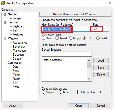 1. Ouvrez PuTTY et indiquez le nom de l’utilisateur, l’adresse IP, et le port à utiliser pour se connecter au serveur.
