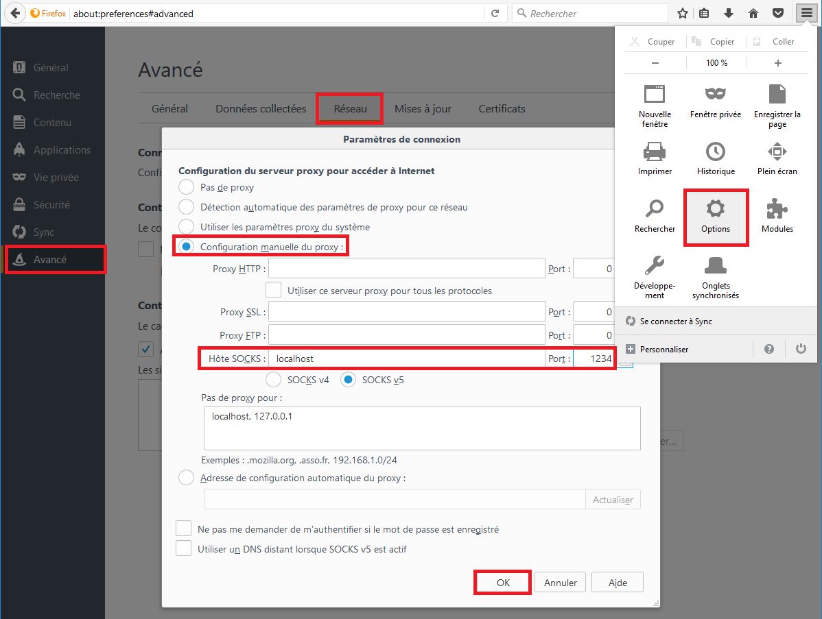 Dernière étape, installer Firefox et configurer un proxy comme indiqué dans la capture ci-dessous :