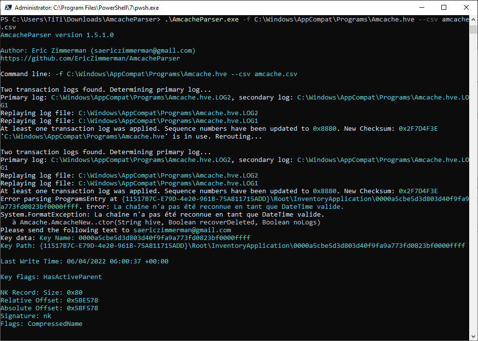 Pour le RecentFileCache c’est le fichier RecentFileCache.bcf dans C:\Windows\AppCompat\Programs que vous trouverez les données… jusqu’à Windows 8. A partire de cette version le fichier à été remplacé par Amcache.hve. Notez l’extension HVE pour Hive : c’est un fichier de registre, directement qui est un peu plus complet de le bcf. Il inclut notamment un condensat SHA1 du programme qui pourra ensuite être utilisé dans un EDR, une campagne de hunting DFIR-ORC, ou tout simplement sur VirusTotal.